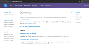 Di situs web tersebut, pilih versi Laragon yang sesuai dengan kebutuhan Anda. Pilih antara Full (termasuk Apache, PHP, MySQL/MariaDB, Node.js, Redis, Memcached) atau Portable (hanya Apache, PHP, MySQL/MariaDB). Pada tutorial ini akan memilih Full.